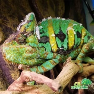 Provide two types of light: one UVB bulb (we recommend the ReptiSun 5.0 for smaller cages and 10.0 for larger) the more foliage you have inside the cage the better, and the higher wattage UVB lamp you will need to provide adequate UVB exposure. If you are utilizing a live plant inside the habitat, consider purchasing a T5 dual lamp fixture and adding one 10k grow / uva lamp for the plant, and and a UVB lamp for the chameleon. Adult chameleons need a basking spot of around 100 degrees Fahrenheit with the ambient temperature between 75 to 85 degrees; smaller panther chameleons should have a basking area of 85 to 90 degrees with a lower ambient temperature of around 75 degrees. It is important for panther chameleons to thermoregulate. That is why you place lights toward the top of the cage.