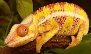 Baby panther chameleons are sexually dimorphic; males are larger (15 to 20 inches total length) with a wider range of colors than females. Depending on mood or visual stimulation, males may display colors that indicate a relaxed or excited state. When a male is excited and “fired-up,” he is likely sending a visual message to a rival male that he is willing to defend his turf, and to a female that he is ready for courtship.